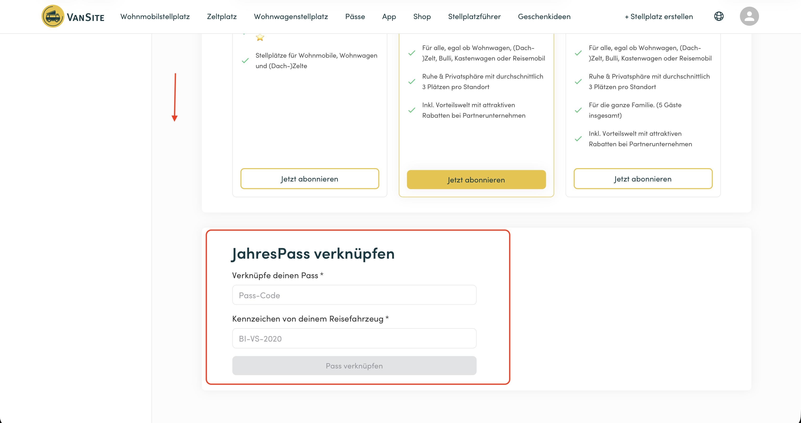 Mit dem VanSite Jahrespass hast du jetzt uneingeschränkten Zugang zu VanSite Stellplätzen in Europa für ein ganzes Jahr. Hier zeigen wir dir, wie du den Jahrespass mit deinem Konto verknüpfst. Solltest du bei der Hinterlegung deines Jahrespasses Schwierigkeiten haben, wende dich gerne jederzeit an unser Support-Team unter support@vansite.eu